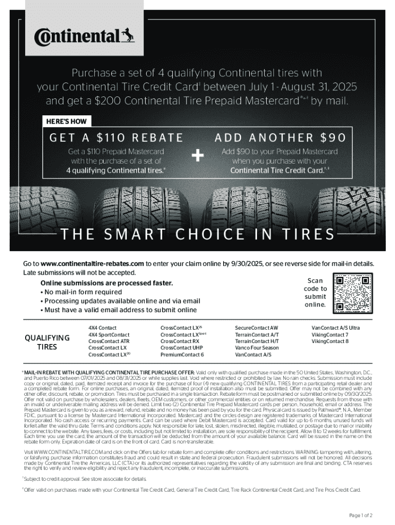 This document provides details about a rebate offer for purchasing a set of 4 qualifying Continental tires using the Continental Tire Credit Card.