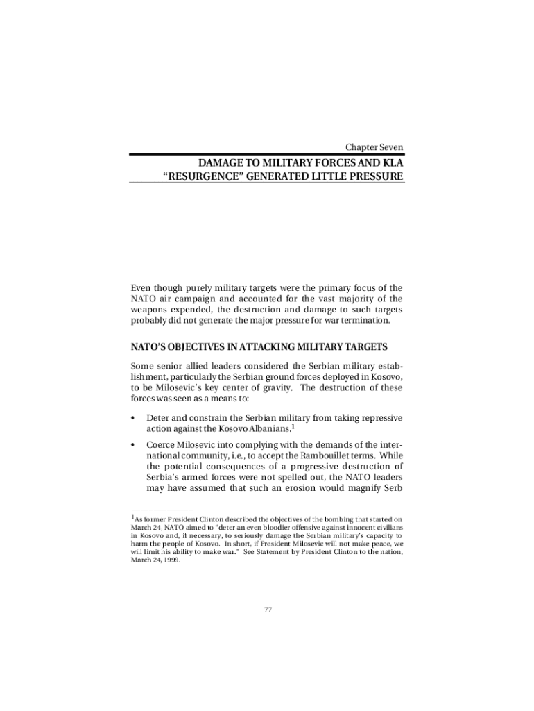 This chapter discusses the damage inflicted on military forces during the NATO air campaign, the impact on Serbian military strategy, and the subsequent developments regarding the Kosovo Liberation