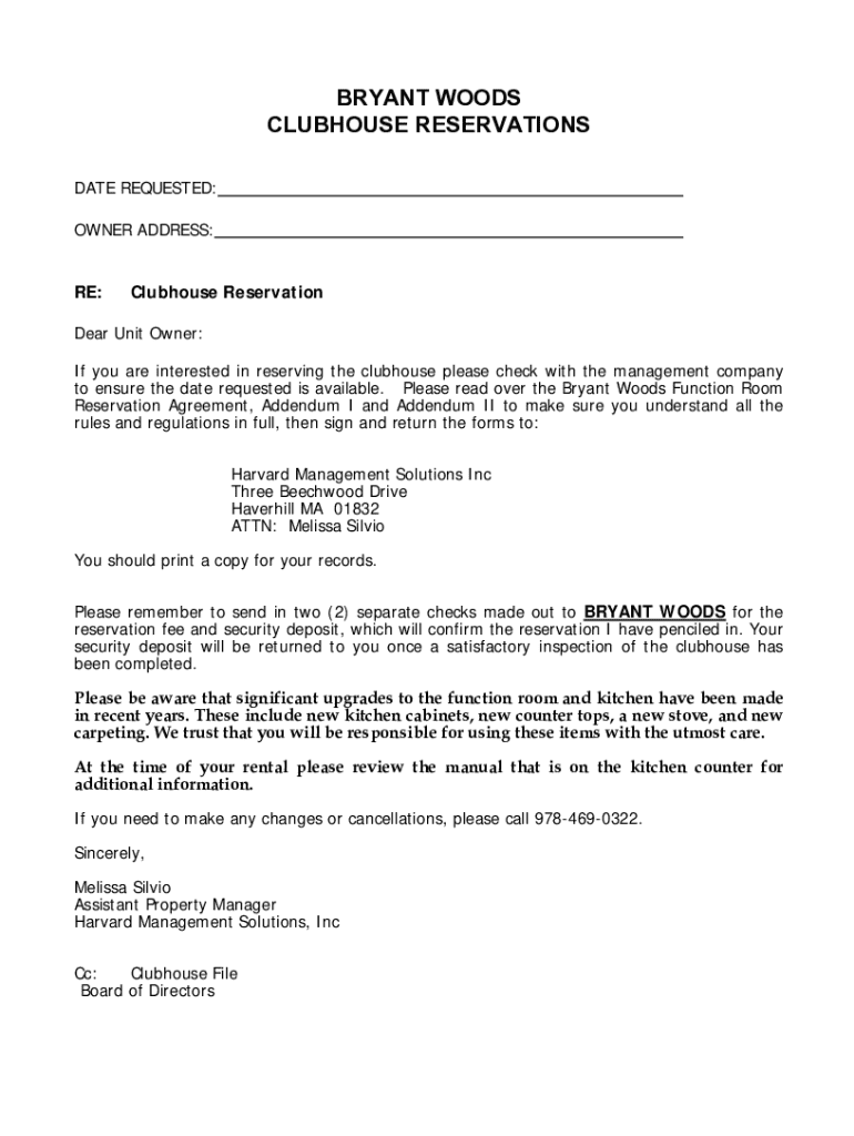 The Bryant Woods Clubhouse Reservation Form is the gateway to securing your event space. Filling out this form accurately ensures that your reservation is processed smoothly. This not only saves time but also reduces the risk of delays due to incomplete information.