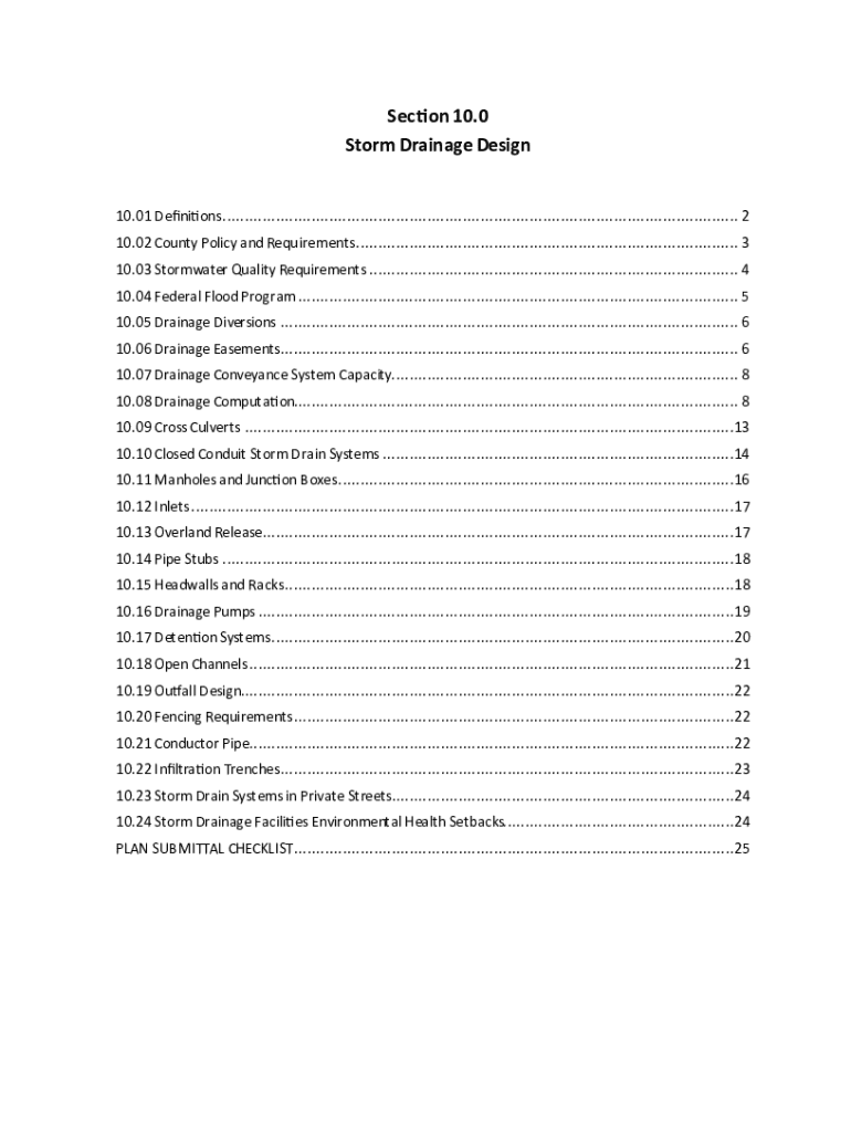 This document outlines the standards, definitions, and requirements for storm drainage design in Butte County, including stormwater quality requirements and guidelines for drainage systems.