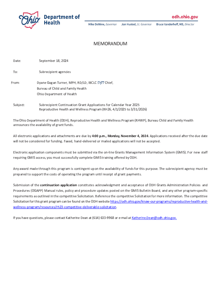 This memorandum outlines the application process for subrecipient agencies seeking grant funding from the Ohio Department of Health\'s Reproductive Health and Wellness Program for the period of April