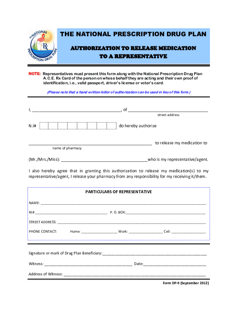 This document serves as an authorization form for a representative to collect medication on behalf of a beneficiary under the National Prescription Drug Plan, requiring identification for both parties.