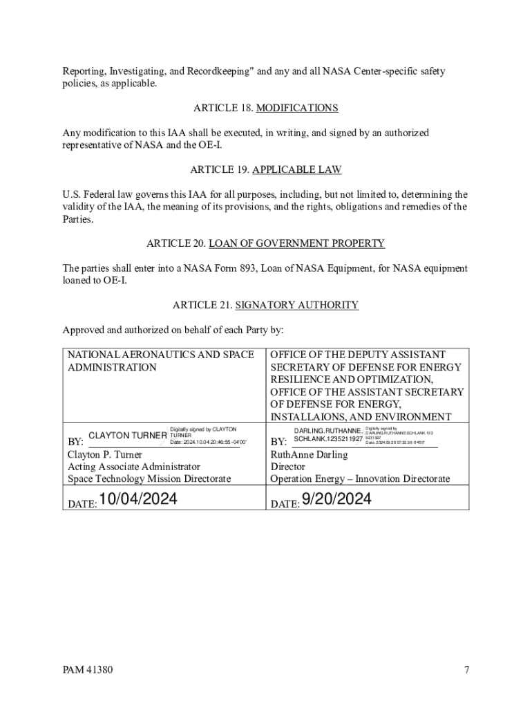 This document outlines the agreement between NASA and the US Department of Defense\'s Operational Energy Innovation Directorate regarding collaboration on the LaserEnabled Power Transmission Orbital