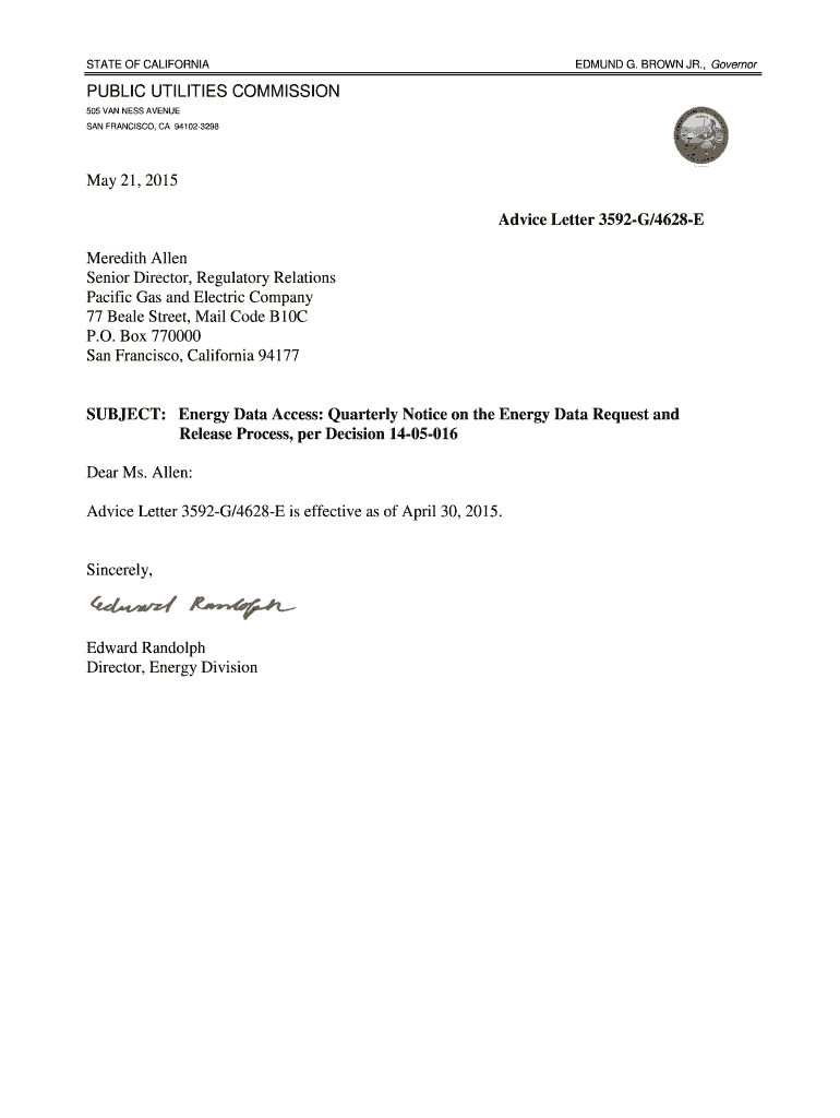 STATE OF CALIFORNIA EDMUND G. BROWN JR., Governor PUBLIC UTILITIES COMMISSION 505 VAN LESS AVENUE SAN FRANCISCO, CA 941023298 May 21, 2015, Advice Letter 3592G/4628E Meredith Allen Senior Director,