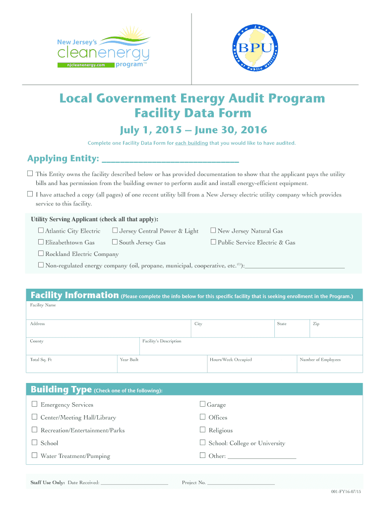 Local Government Energy Audit Program Facility Data Form July 1, 2015, June 30, 2016, Complete one Facility Data Form for each building that you would like to have audited. Applying Entity: This Entity