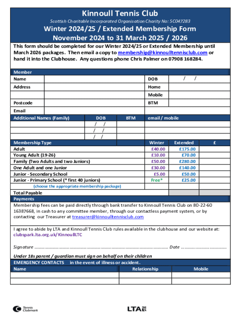 The Kinnoull Tennis Club Extended Form is an essential document designed for both new and returning members to capture important personal and membership details. It serves a dual purpose: enabling the club to maintain accurate member records while also providing members with an opportunity to share any changes in their personal information. Completing this form accurately is critical, as it ensures effective communication and a smooth onboarding process.