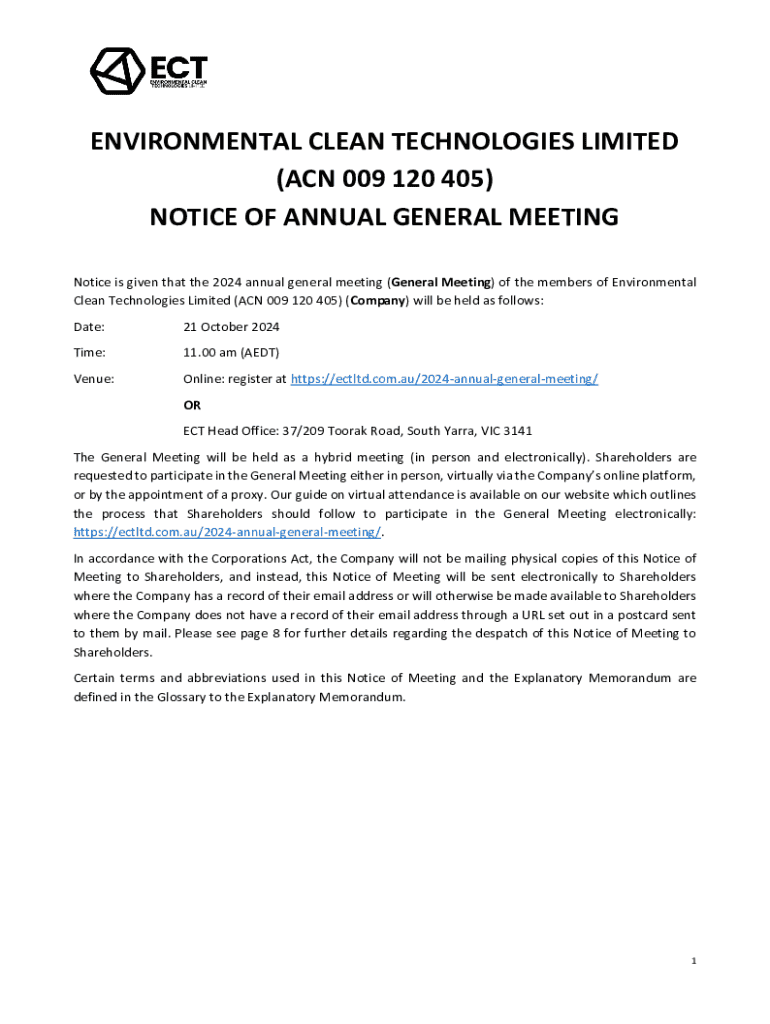 The document provides details regarding the 2024 Annual General Meeting for Environmental Clean Technologies Limited, including the date, time, venue, resolutions to be voted on, and guidelines for