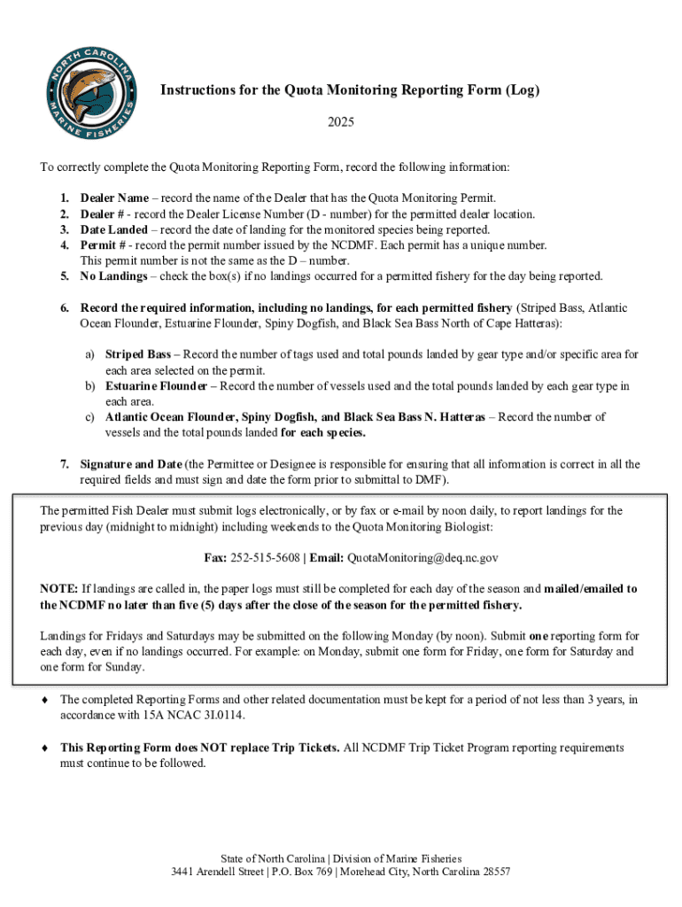 Quota monitoring involves tracking the amounts and types of resources harvested from marine environments, particularly focusing on fish species. It is essential for sustainable resource management, ensuring that industries operate within legal catch limits set by regulatory bodies. The quota monitoring reporting form is a critical tool in this process, collecting data that helps manage fish stocks and maintain ecological balance.