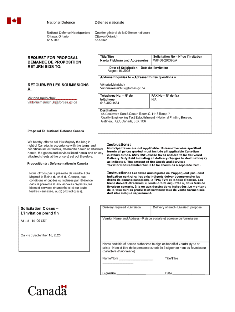 Ce document est une demande de proposition du ministre de la Dfense nationale du Canada pour l\'acquisition de matriel et d\'accessoires Narda Fieldman, dtaillant les instructions de soumission et