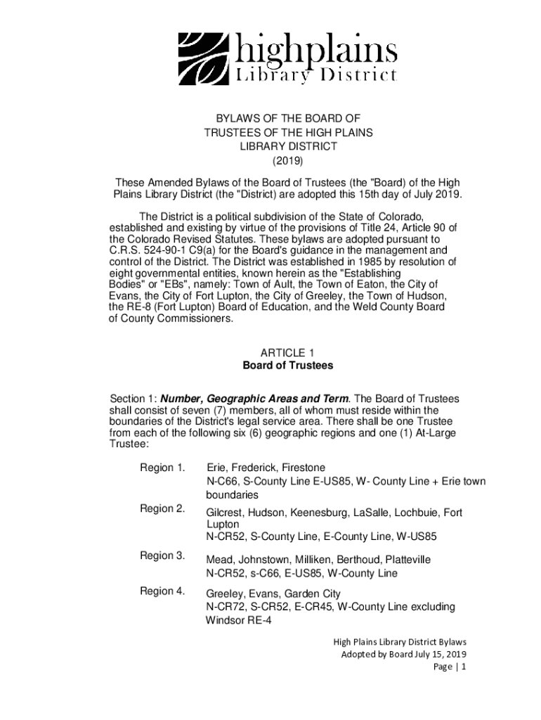 Get the free Bylaws of the Board of Trustees of the High Plains Library District