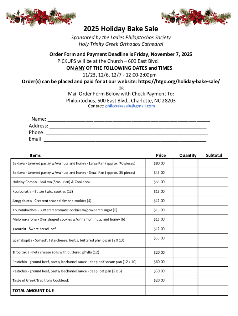 The 2025 holiday bake sale form plays a critical role in organizing successful fundraising events. Its primary purpose is to facilitate the sale of baked goods, allowing organizations to raise money while engaging with the community. By having a structured form, event organizers ensure all necessary information is captured, fostering better communication and a smoother process for both bakers and buyers.