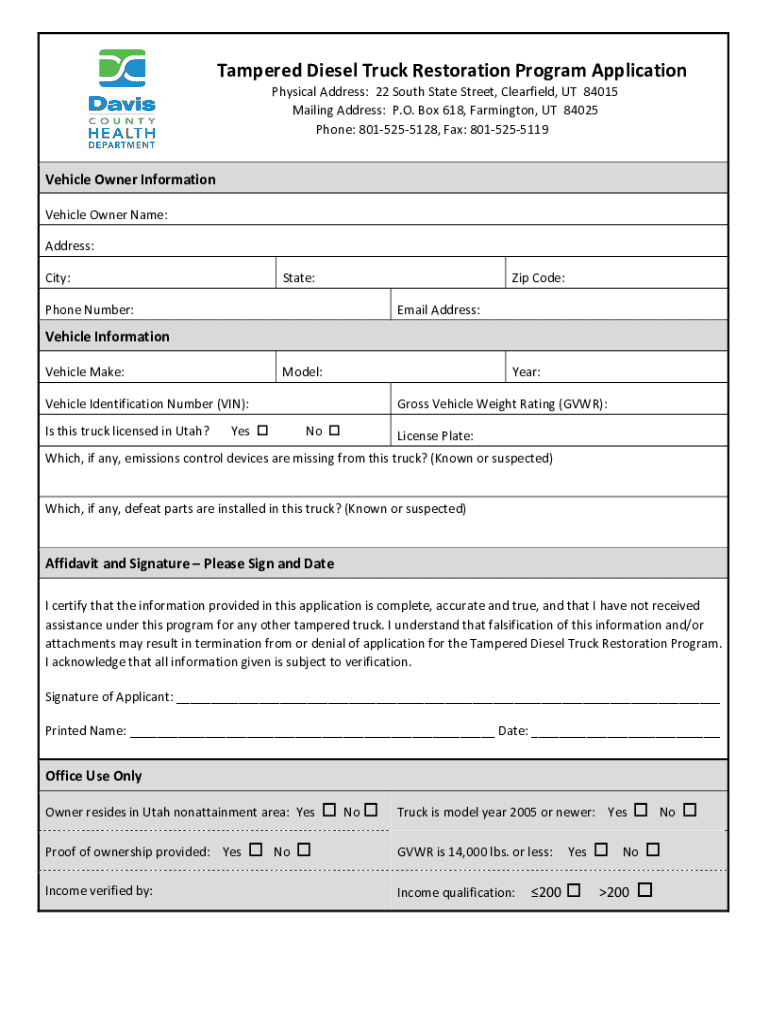 Completing the tampered diesel truck restoration form requires specific information to ensure an effective restoration process. The first section should encompass detailed vehicle information, including the Vehicle Identification Number (VIN), make, and model. Accurately documenting these elements is necessary for accurate records.