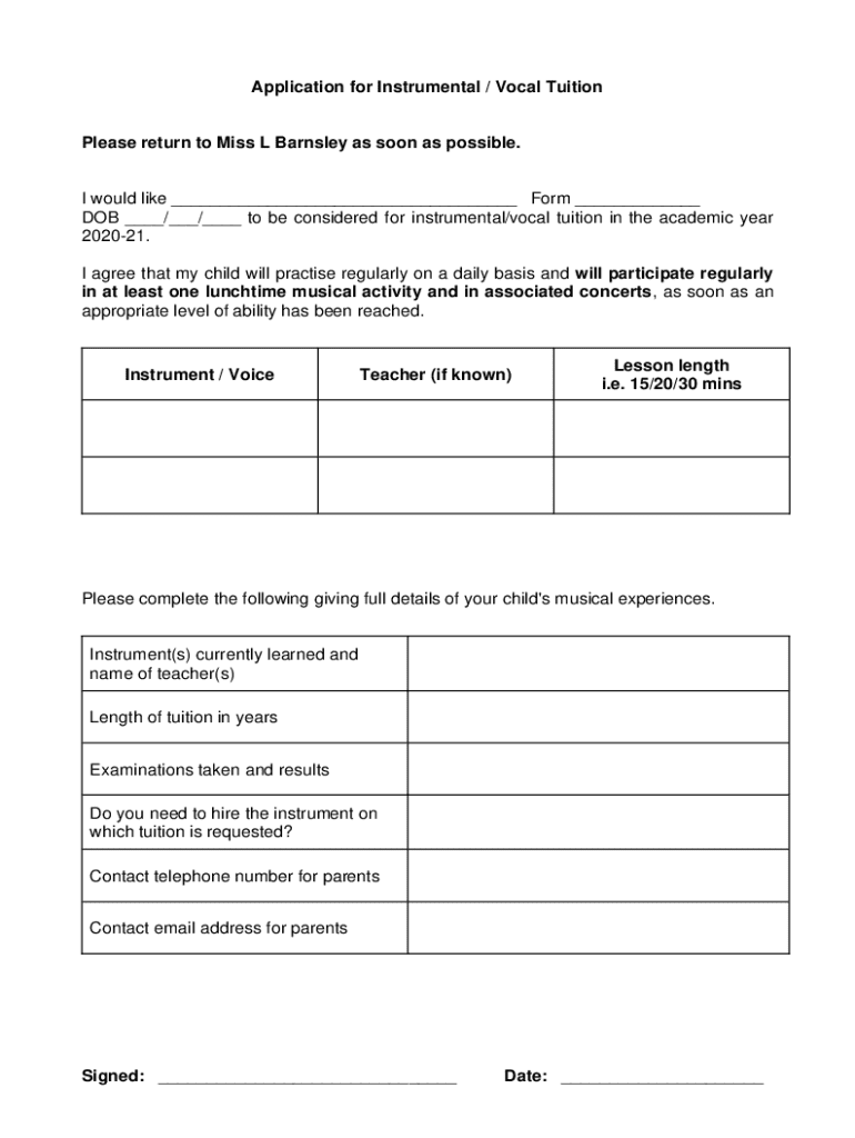 This document is an application form for enrolling a child in instrumental or vocal lessons for the academic year 202021, detailing required information about the child\'s music background and contact