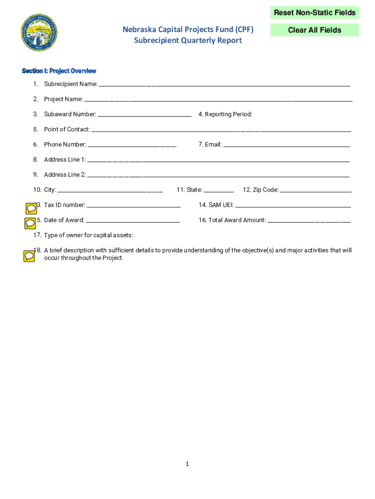 This document serves as a quarterly reporting form for subrecipients of the Nebraska Capital Projects Fund, capturing essential project information, financial details, and compliance aspects.