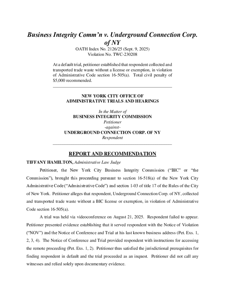 This document provides the findings and recommendations after a trial concerning a violation of trade waste collection regulations by Underground Connection Corp. of NY, which was found to have collected