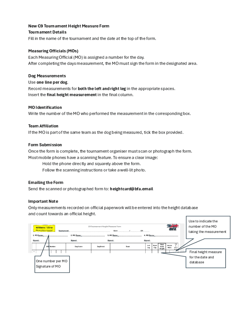 Submitting the C9 Tournament Height Form requires certain eligibility criteria to ensure that only qualified players and teams participate. Generally, teams or individual players must be officially registered in the tournament, with a specific focus on certain age groups or categories. This typically includes youth leagues, collegiate competitions, and professional circuits, ensuring inclusivity across various competitive levels.