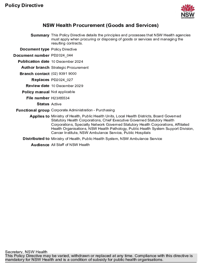 This Policy Directive details the principles and processes that NSW Health agencies must apply when procuring or disposing of goods or services and managing the resulting contracts.