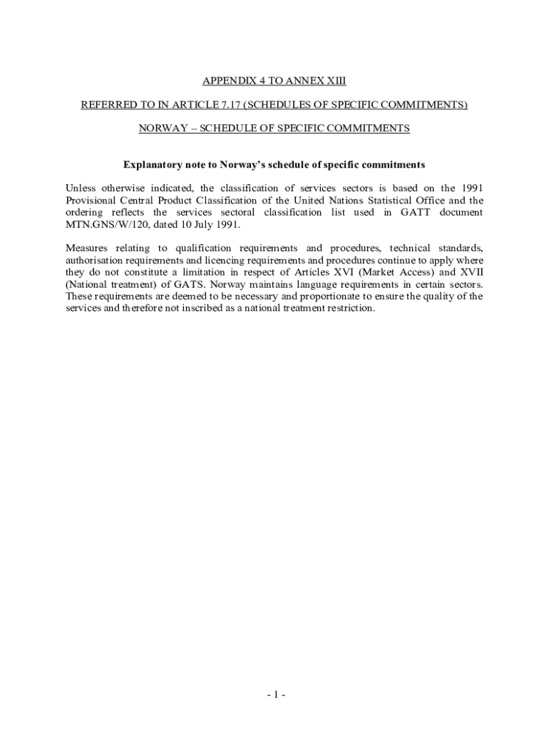 This document outlines Norway\'s specific commitments regarding market access and national treatment under the General Agreement on Trade in Services (GATS), detailing horizontal and sectorspecific