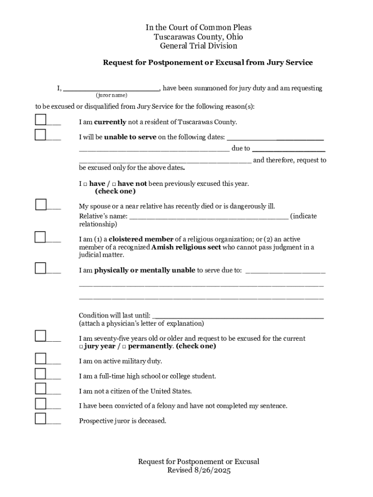 This document is a request form for individuals summoned for jury duty in Tuscarawas County, Ohio, allowing them to apply for postponement or excusal from service for specified reasons.