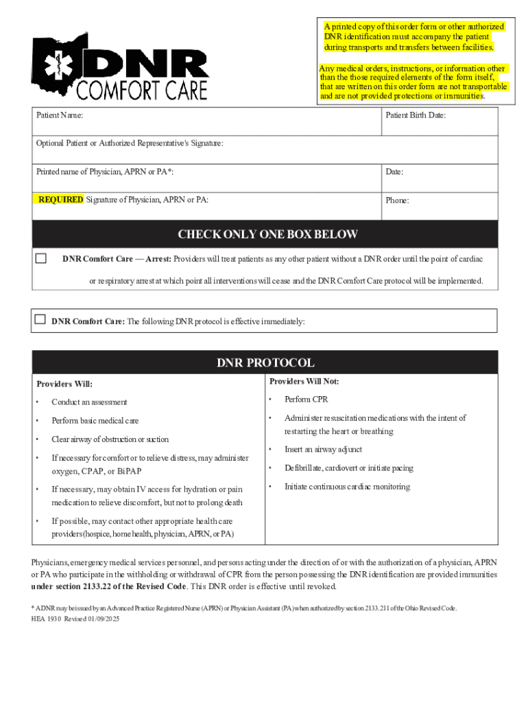This document serves as an order form for Do Not Resuscitate (DNR) protocols, outlining the procedures and protections for patients with DNR identification during medical emergencies.