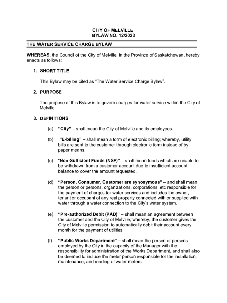This Bylaw governs charges for water service within the City of Melville and outlines the procedure for water service applications, billing, payment, and disconnection.