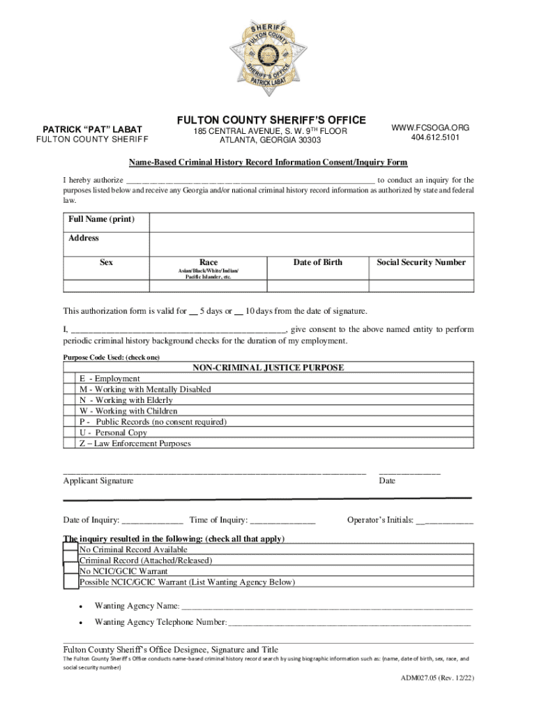 Get the free Name-based Criminal History Record Information Consent/inquiry Form