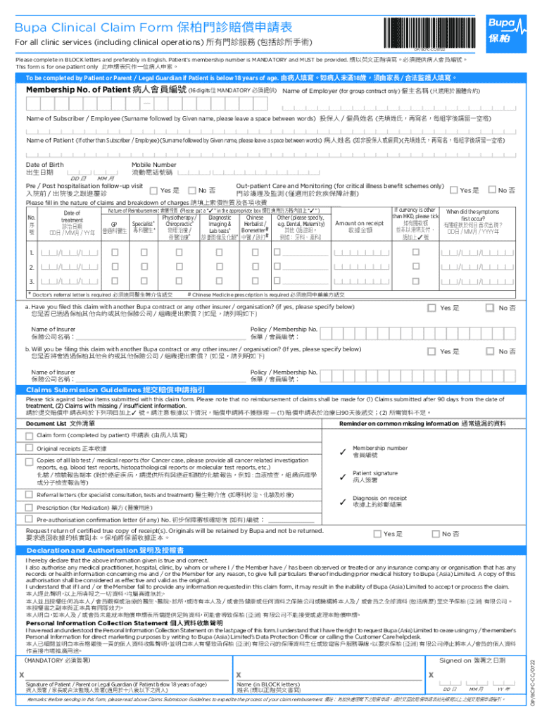 The Bupa Clinical Claim Form serves a pivotal role in facilitating healthcare reimbursement for patients covered by Bupa insurance. This form allows individuals to claim benefits for medical services they have already paid for out of their pockets. It acts as a formal request for reimbursement from Bupa, ensuring that policyholders are compensated for eligible medical expenses. Knowing how to fill it out correctly is essential for ensuring timely reimbursement.