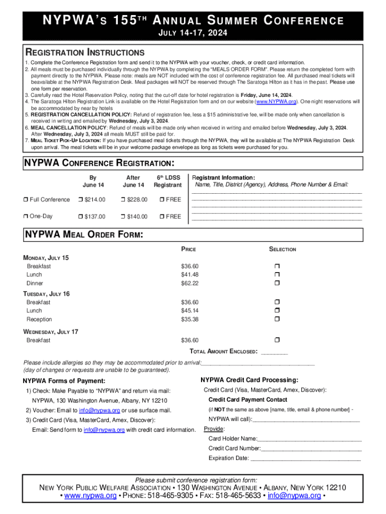 This document contains information about the registration and hotel booking procedures for the NYPWA 155th Annual Summer Conference, including meal options and cancellation policies.