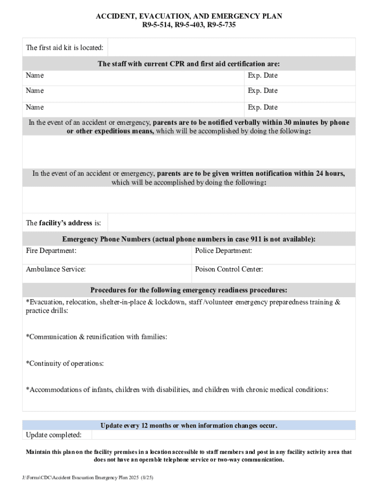 AZ Accident Evacuation Emergency Plan 2025-2026 free printable template