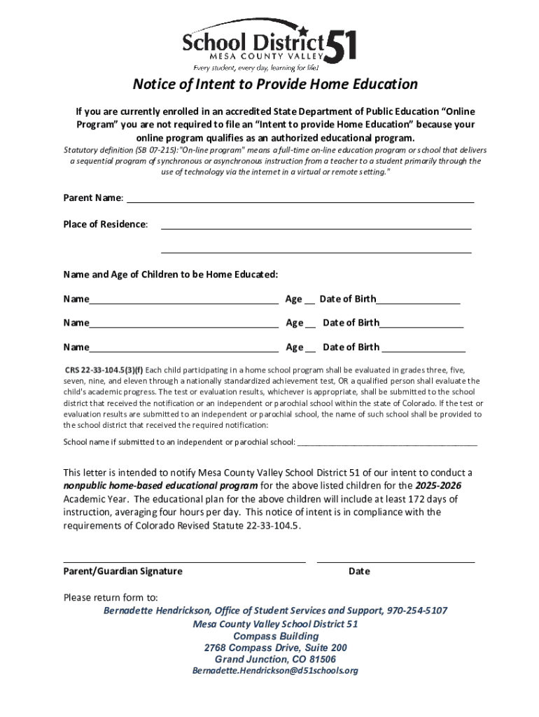 Get the free Notice of Intent to Provide Home Education