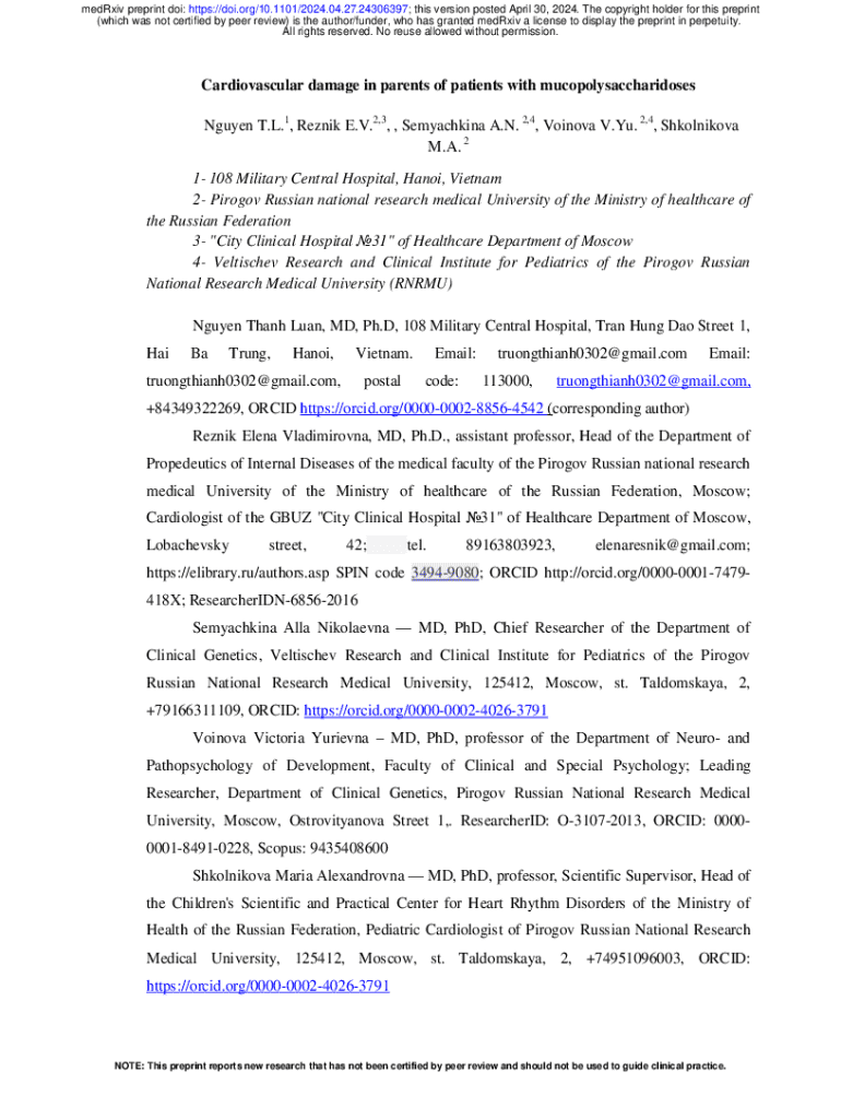 This document presents a study on cardiovascular abnormalities in parents of children with mucopolysaccharidoses (MPS). The study examines the prevalence of cardiovascular pathology among MPS carriers,