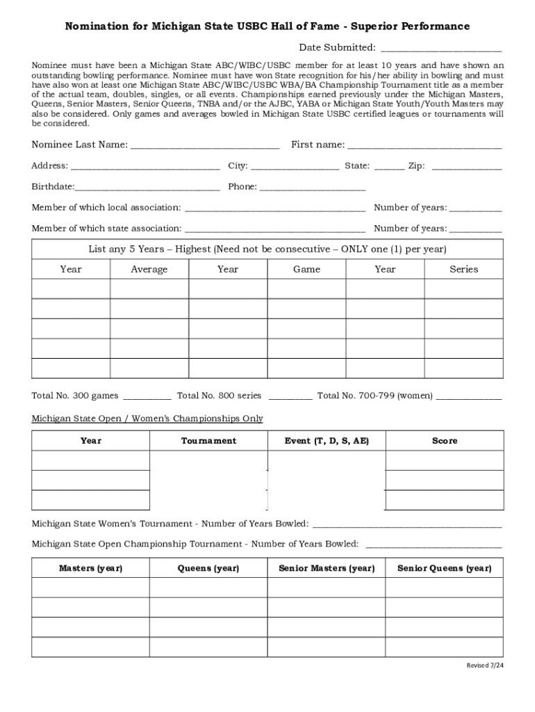 Get the free Nomination for Michigan State Usbc Hall of Fame - Superior Performance