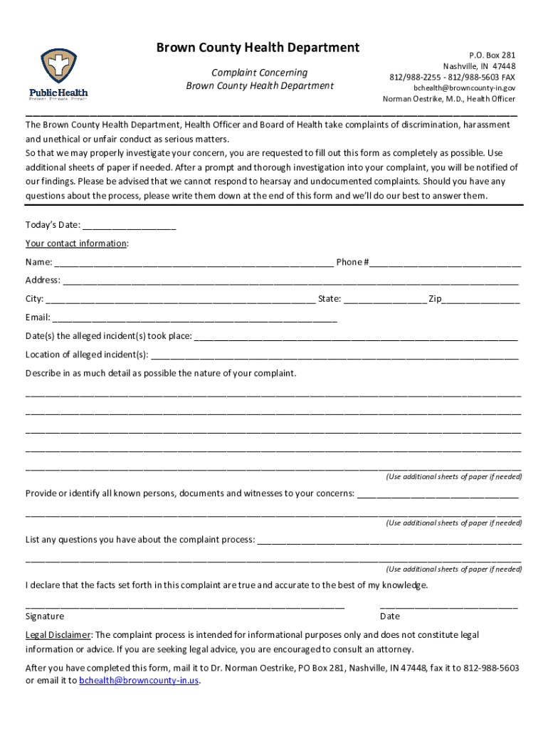 Get the free Brown County Health Department Complaint