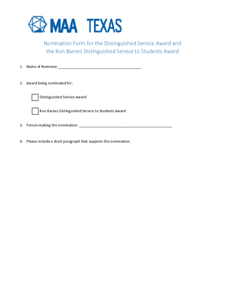 Get the free Nomination Form for the Distinguished Service Award and the Ron Barnes Distinguished...