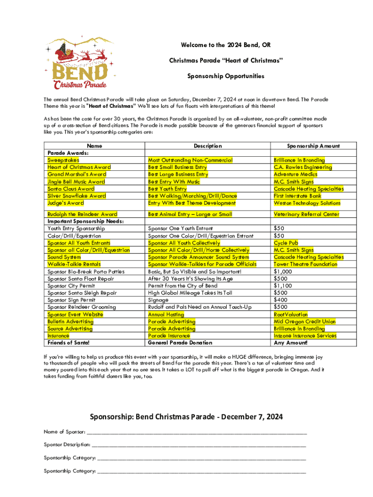Obtain the Bend Christmas Parade Sponsorship form from the official event website or local community center.