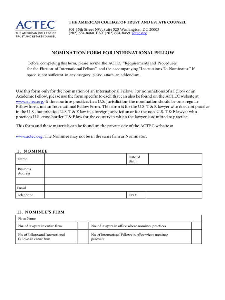Este formulario es utilizado para nominar a un abogado de T & E Internacional para el Colegio Americano de Abogados de Fideicomisos y Patrimonios (ACTEC). Este formulario debe ser completado siguiendo