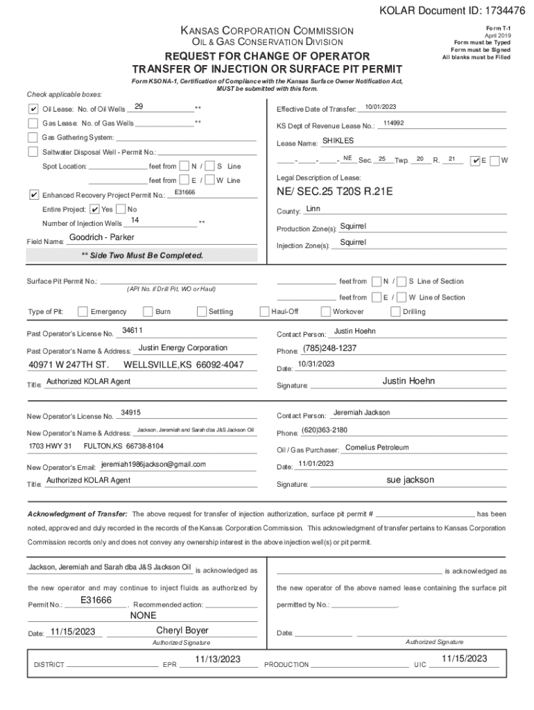 This document is a request to change the operator and transfer the permits related to injection or surface pit operations within the jurisdiction of the Kansas Corporation Commission.