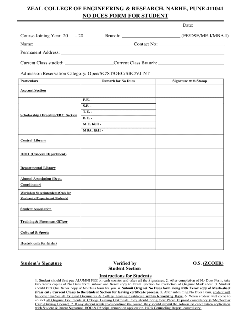This document is a No Dues form for students at Zeal College of Engineering & Research, outlining the procedures for clearing dues and obtaining final documents upon course completion.