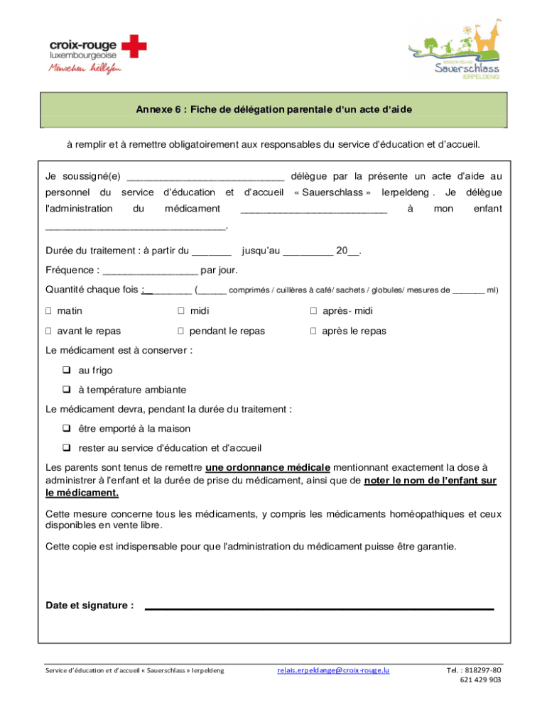 Ce document est destin permettre aux parents de dlguer l\'administration d\'un mdicament leur enfant par le personnel du service d\'ducation et d\'accueil.