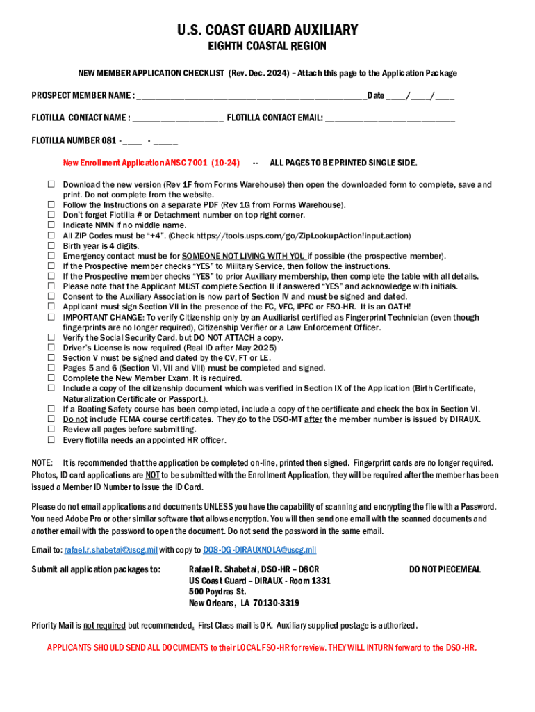 This document serves as a checklist to ensure all required items and steps are completed for the U.S. Coast Guard Auxiliary new member application process.