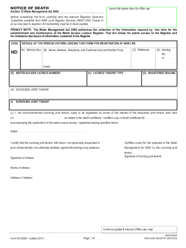 Completing the Notice of Death Form requires specific information about the deceased. Essential details include the deceased’s full name, date of birth, date of death, address, and other relevant identifying information. The form will also ask for the informant's details—this is the person filling out the form, typically a family member or legal representative.