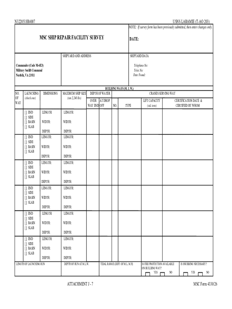 This document is a survey form for assessing ship repair facilities, detailing various aspects such as shipyard data, launching capabilities, dimensions, dry docks, cranes, and employment capacity.