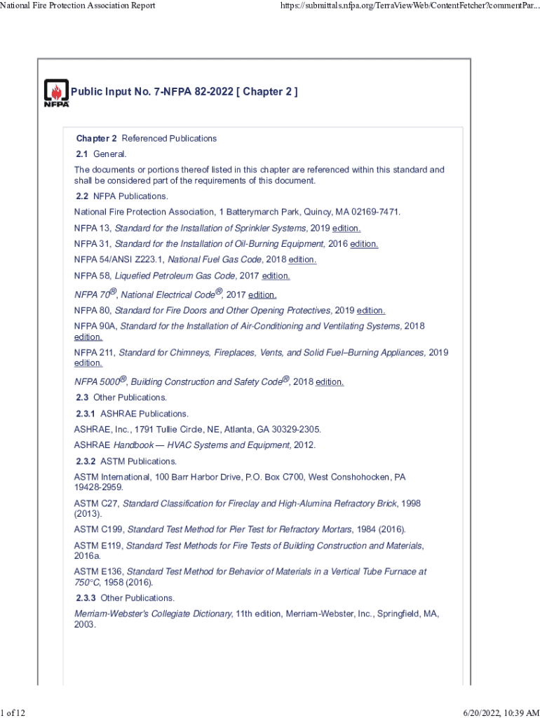This document includes public input and revisions related to NFPA 82, focusing on various standards, test methods, and installation requirements for fire safety, specifically regarding chimneys, incinerators,