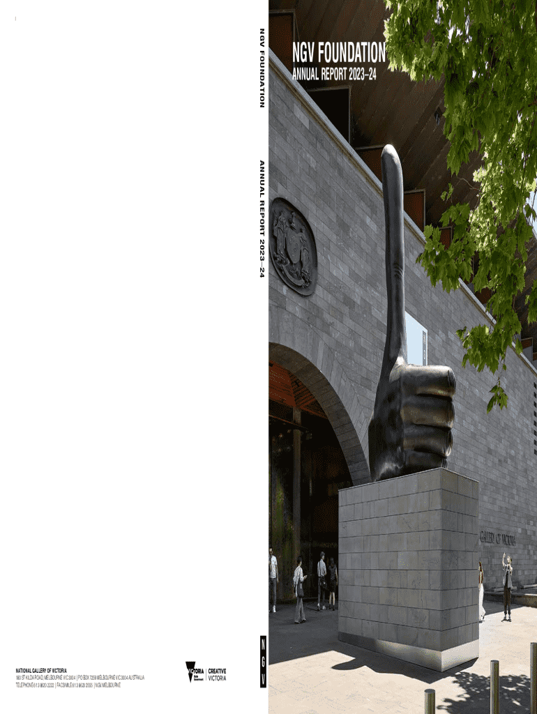 This document serves as the annual report for the NGV Foundation, detailing its activities, financial performance, and contributions to the National Gallery of Victoria for the fiscal year 202324.