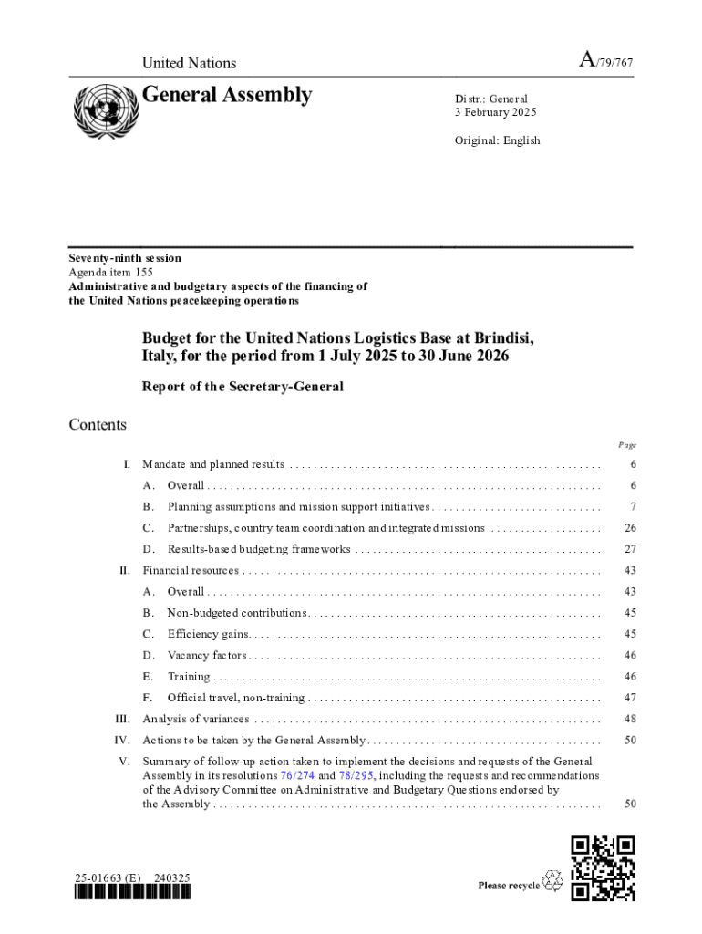 This document outlines the proposed budget amounting to $58,281,000 for the United Nations Logistics Base at Brindisi, detailing financial allocations, staffing, operational plans, and strategic objectives