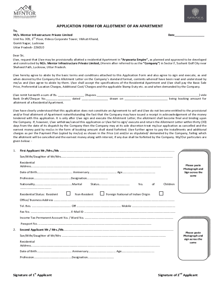Get the free Application Form for Allotment of an Apartment