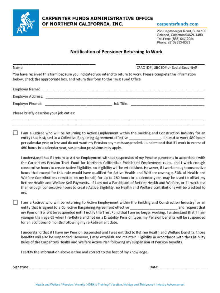 Email, fax, or share your notification of pensioner returning form via URL. You can also download, print, or export forms to your preferred cloud storage service.