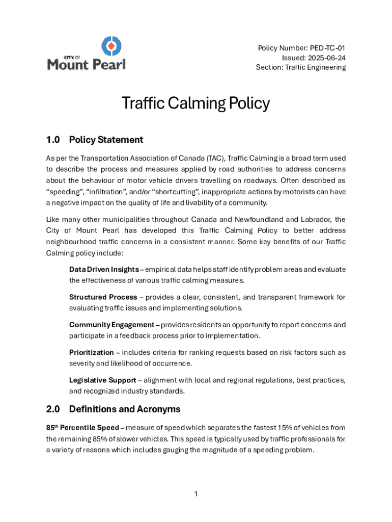 This document outlines the Traffic Calming Policy of the City of Mount Pearl, detailing the procedures and measures to manage traffic concerns and enhance safety for motorists, pedestrians, and cyclists.