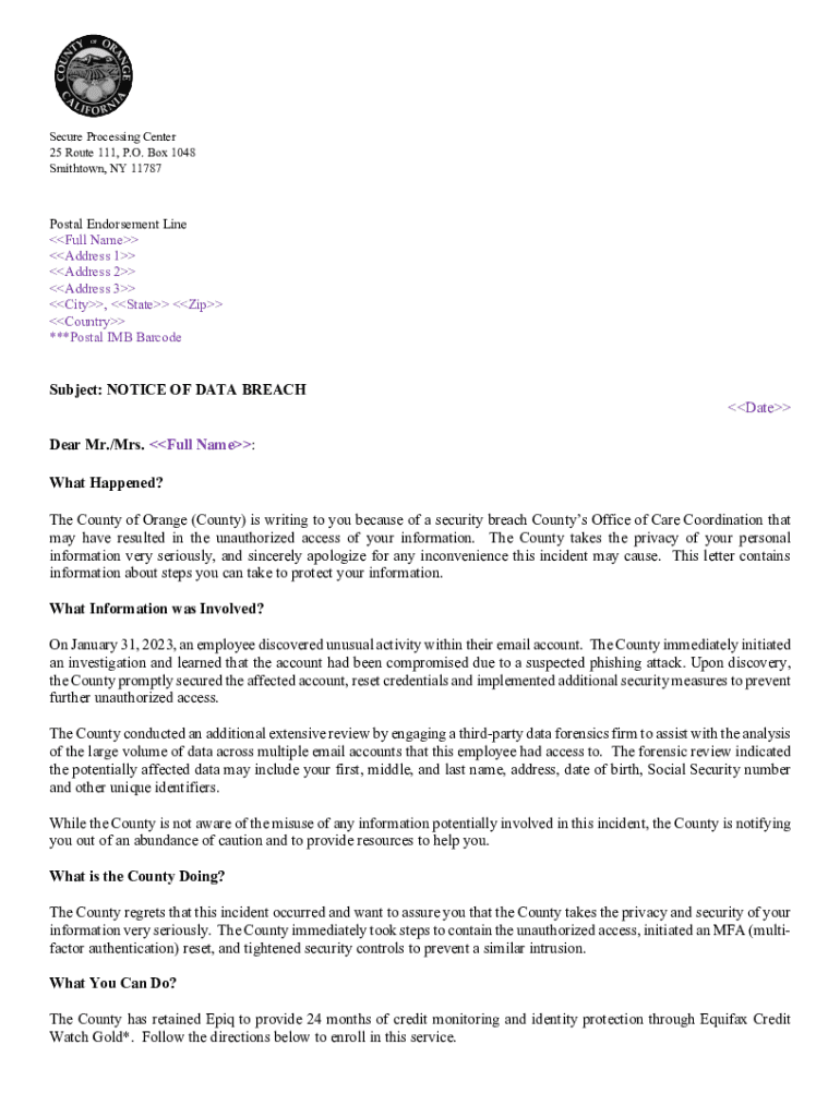 Get the free Notice of Data Breach - oag ca