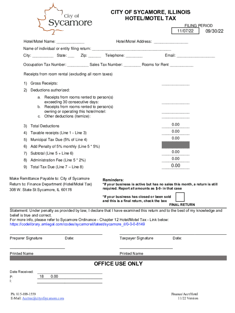 This document is used by hotels and motels in the City of Sycamore, Illinois, to file their tax returns for the hotel/motel tax as required by local ordinance.